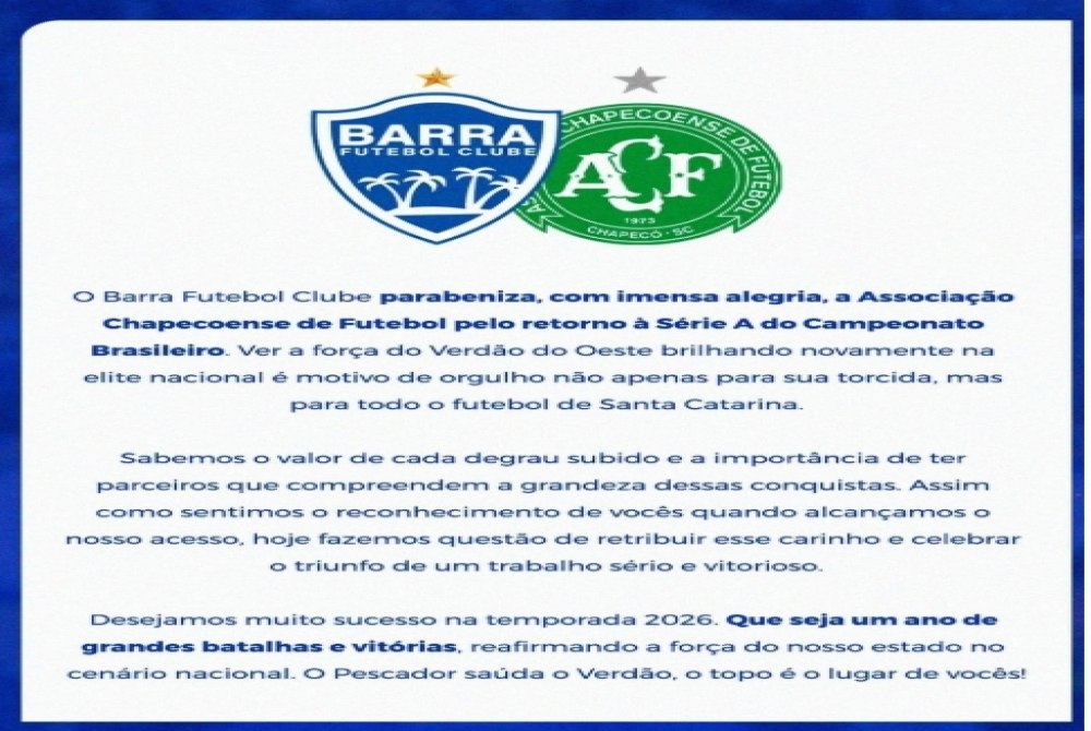 "O Barra Futebol Clube parabeniza, com imensa alegria, a Associação Chapecoense de Futebol pelo retorno à Série A do Campeonato Brasileiro. Ver a força do Verdão do Oeste brilhando novamente na elite nacional é motivo de orgulho não apenas para sua torcida, mas para todo o futebol de Santa Catarina.